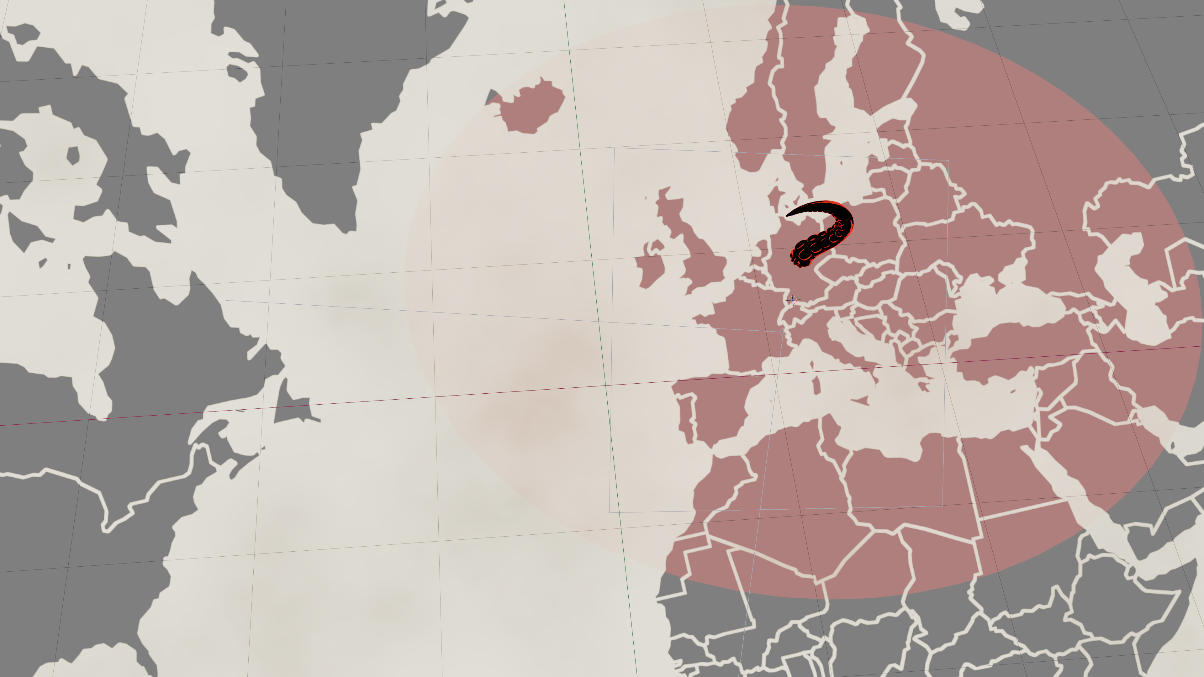 After the bomb drops, the aftermath is revealed. A red circle shows the effect of the blast, but something unexpected appears. The tentacle uses a similar shader to the bombers and wiggles around by being deformed on a curve.