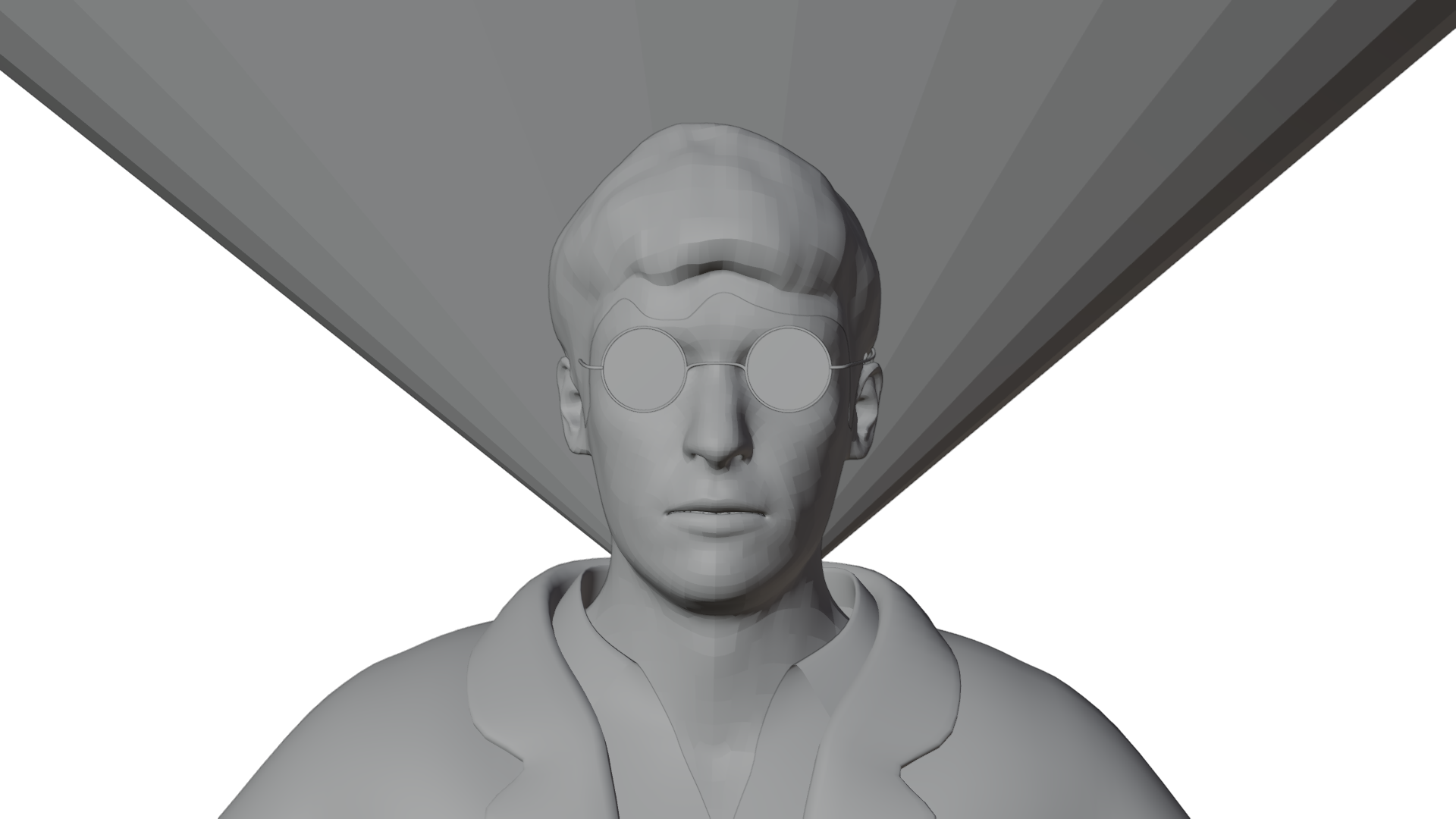 Finally, we see the human head on. The two different backgrounds are brought together as the human is haloed by the beams.